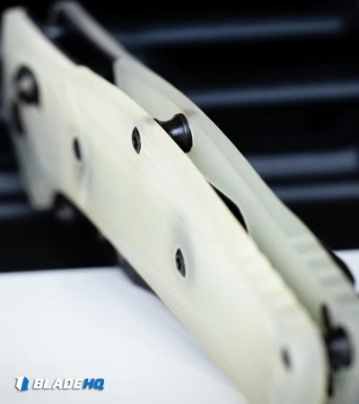 - Jade G-10 handle is translucent, showing off the inner workings.